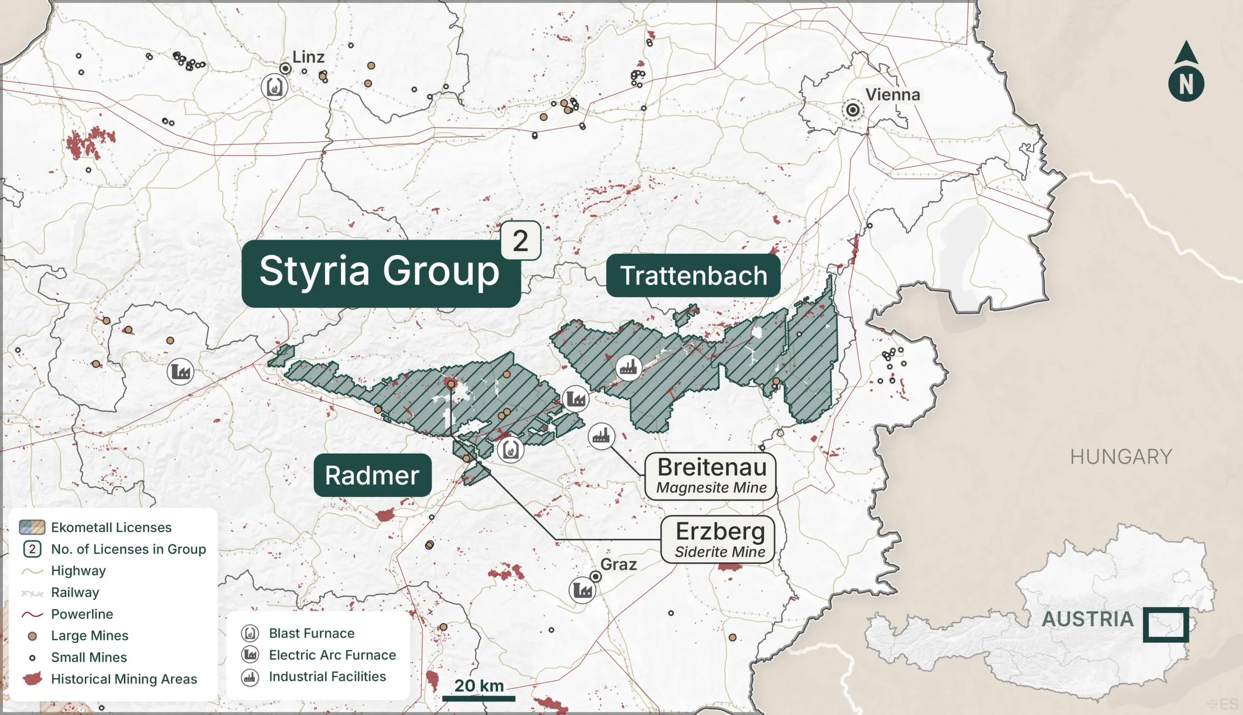 The Styria Group sits on the Greywacke Zone, the Paleozoic sedimentary and volcanic belt that runs continuously along the northern flank of the Eastern Alps through Styria and into Lower Austria. This is Austria’s most historically productive metallogenic belt, hosting iron, base metals, magnesite, and gold mineralization across centuries of systematic exploitation.